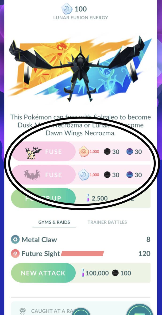 For Solar Fusion Energy, you'll need to defeat a Dusk Mane Necrozma in a raid. While Lunar Fusion Energy requires you to defeat Dawn Wings Necrozma in a raid. Yes, it's basically the same method you use to gather Mega Energy and Primal Energy! Keep in mind that both of these Pokémon are quite powerful, so your chances of beating them alone are very slim. For this reason, it's a good idea to team up with a group of players or use Remote Raid Passes when gathering Fusion Energy.