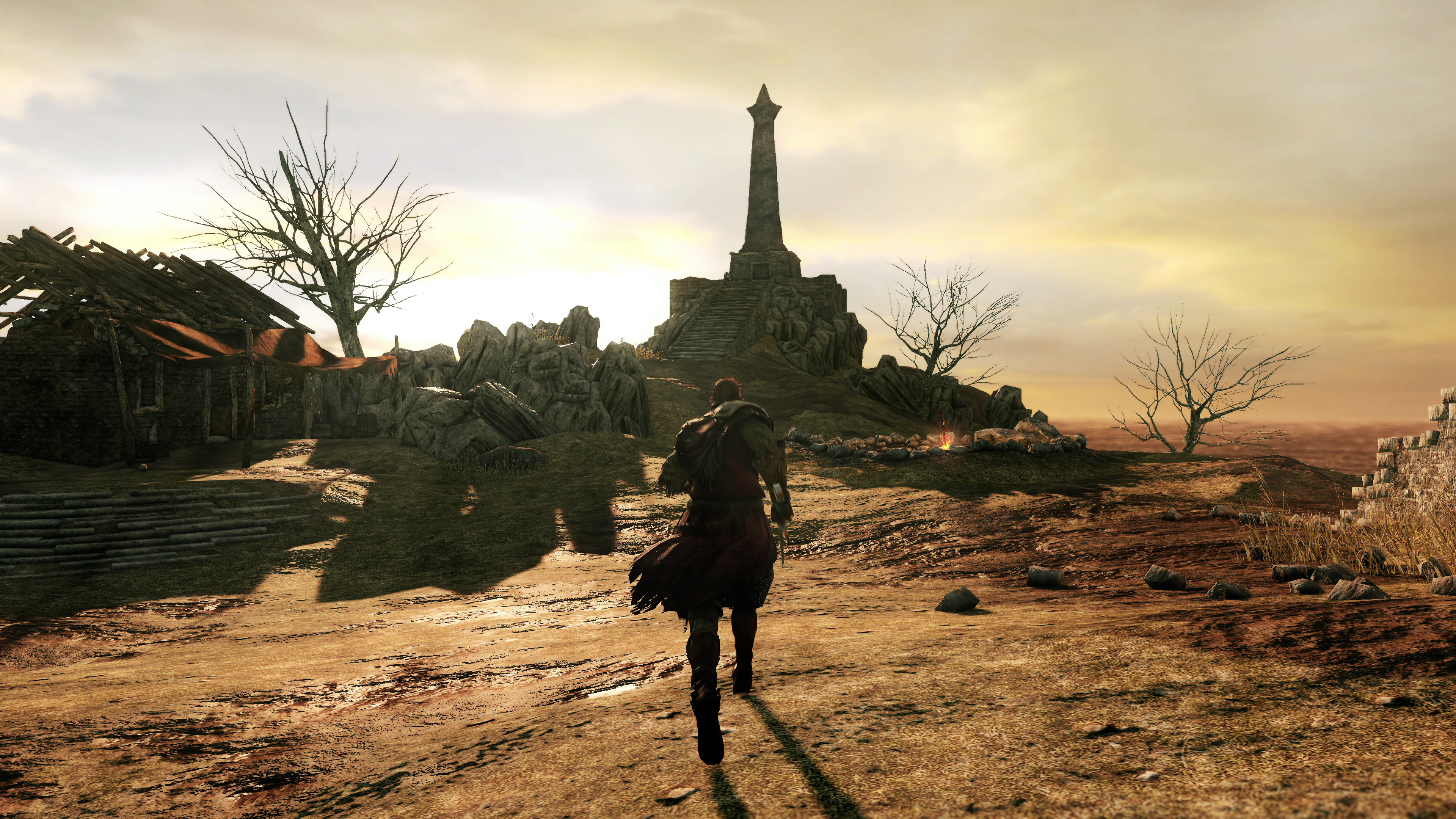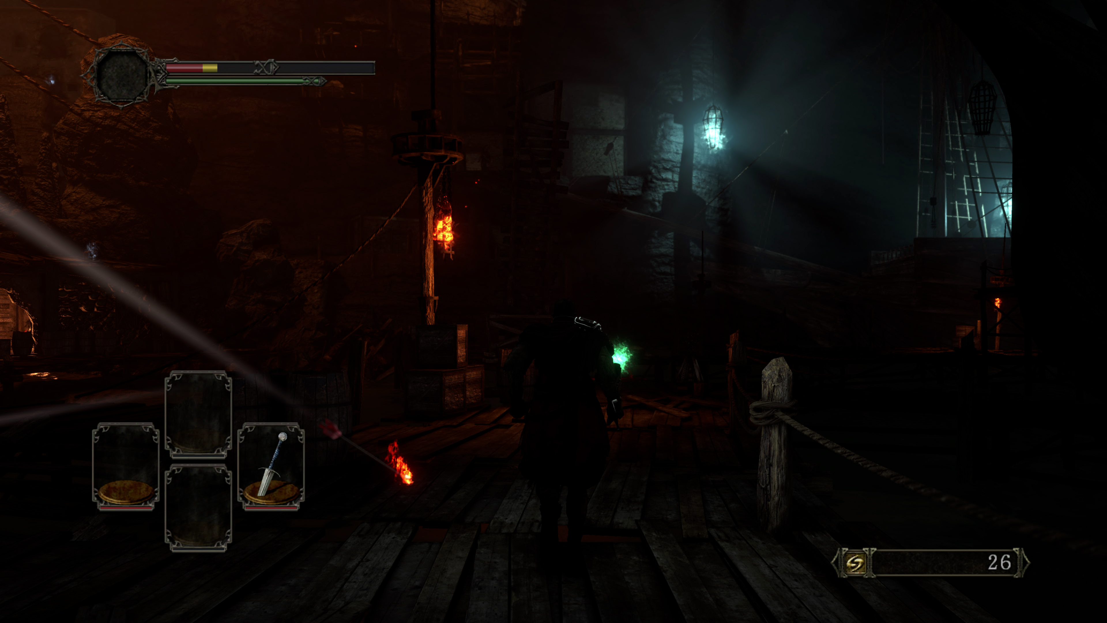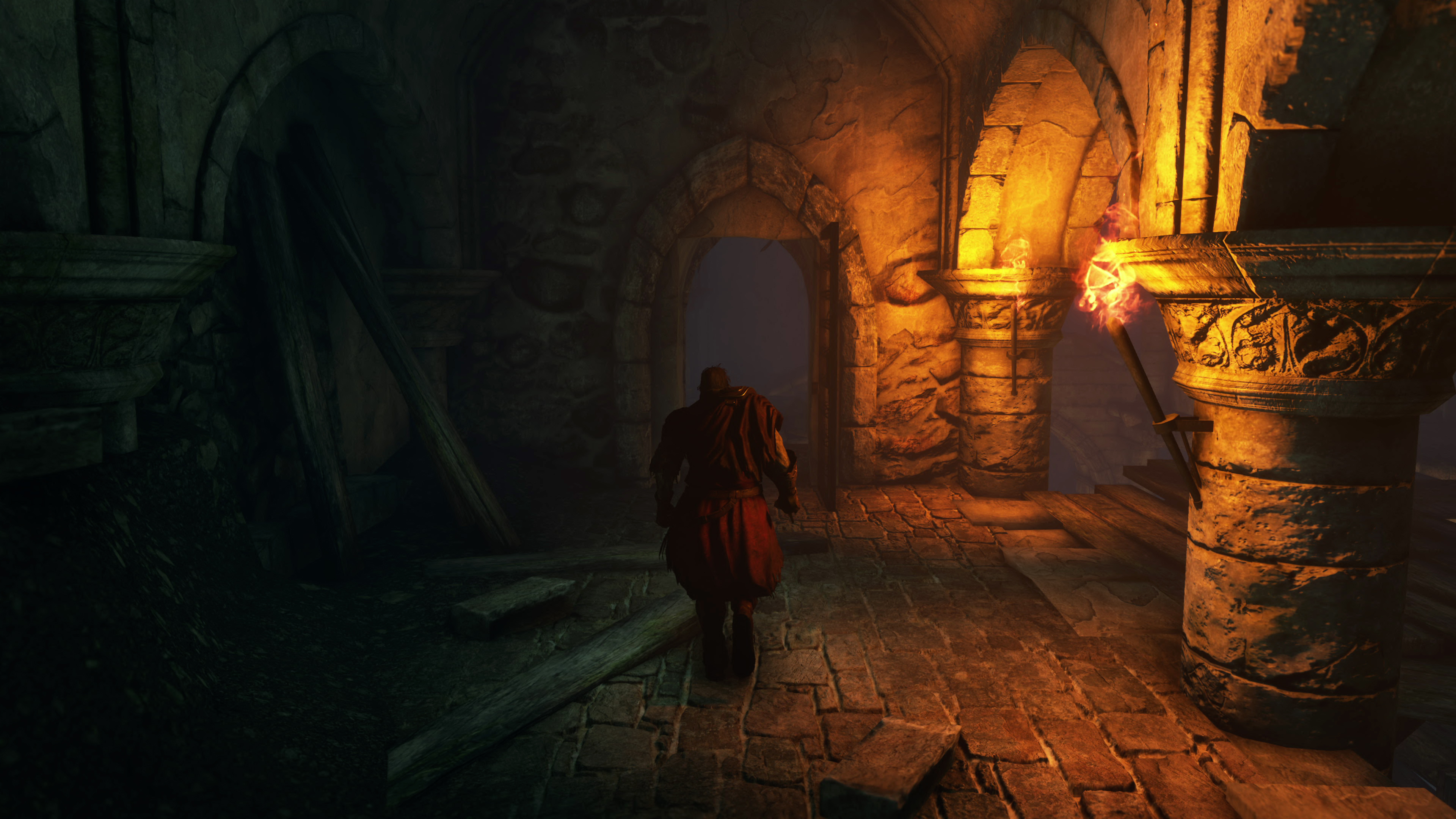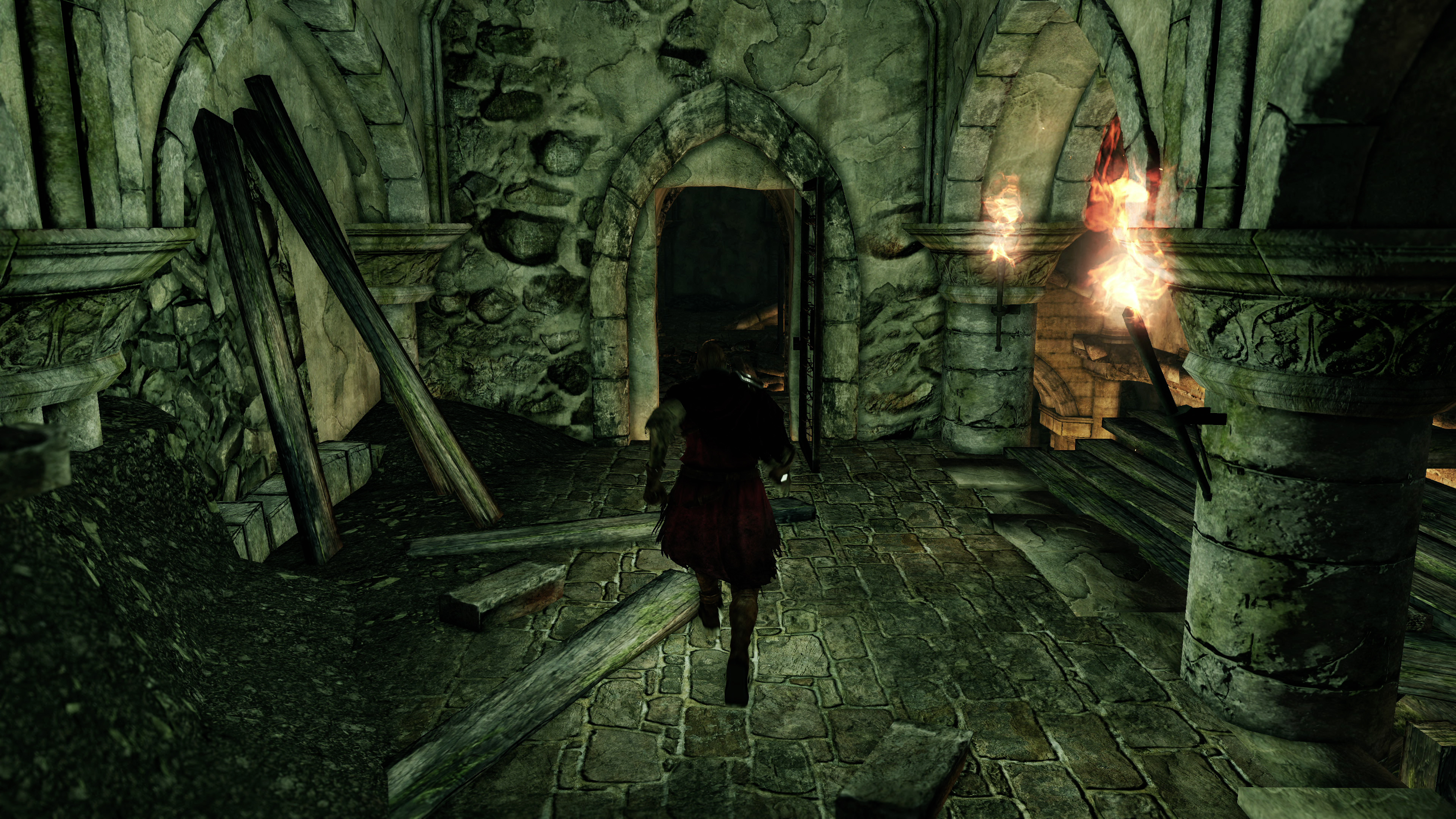 Sticking with the shadow upgrades, let's check out a few interior spots. Secondary lights, like torchlights in connecting dungeons, now cause the character to cast a proper shadow. In fairness, we already had shadows cast from bonfires and the sun in the original Dark Souls 2, but their application was limited elsewhere. Lamps simply cast no shade as you walk by, which is a limit that's even true of Elden Ring today. The Lighting Engine mod fixes that, and using PCSS we get these sharp shadow outlines on nearby surfaces, from torchlight. Additionally, the Lighting Engine allows specular highlights to bounce back from these torches, with a more detailed reaction across the nearby stone.