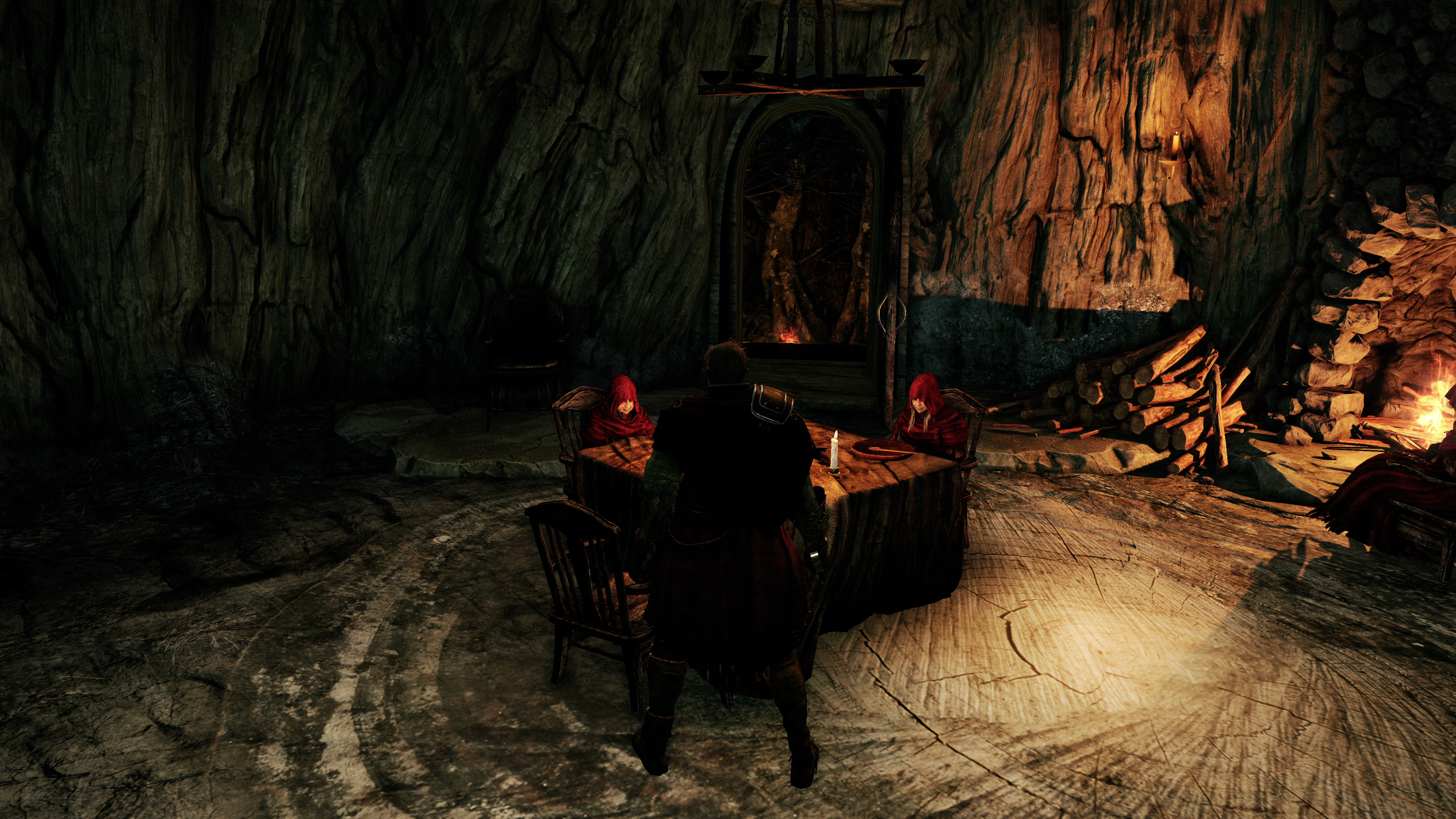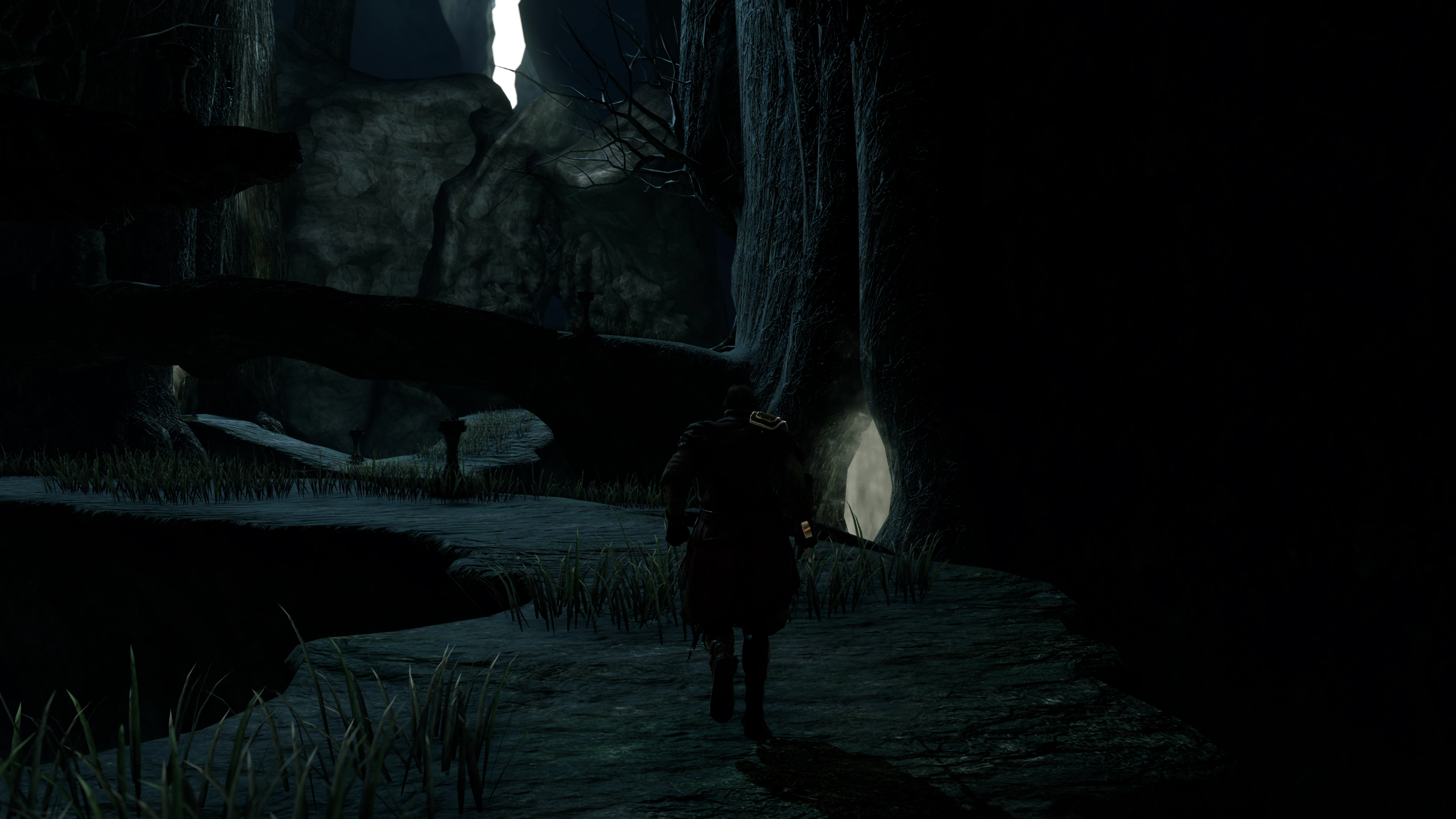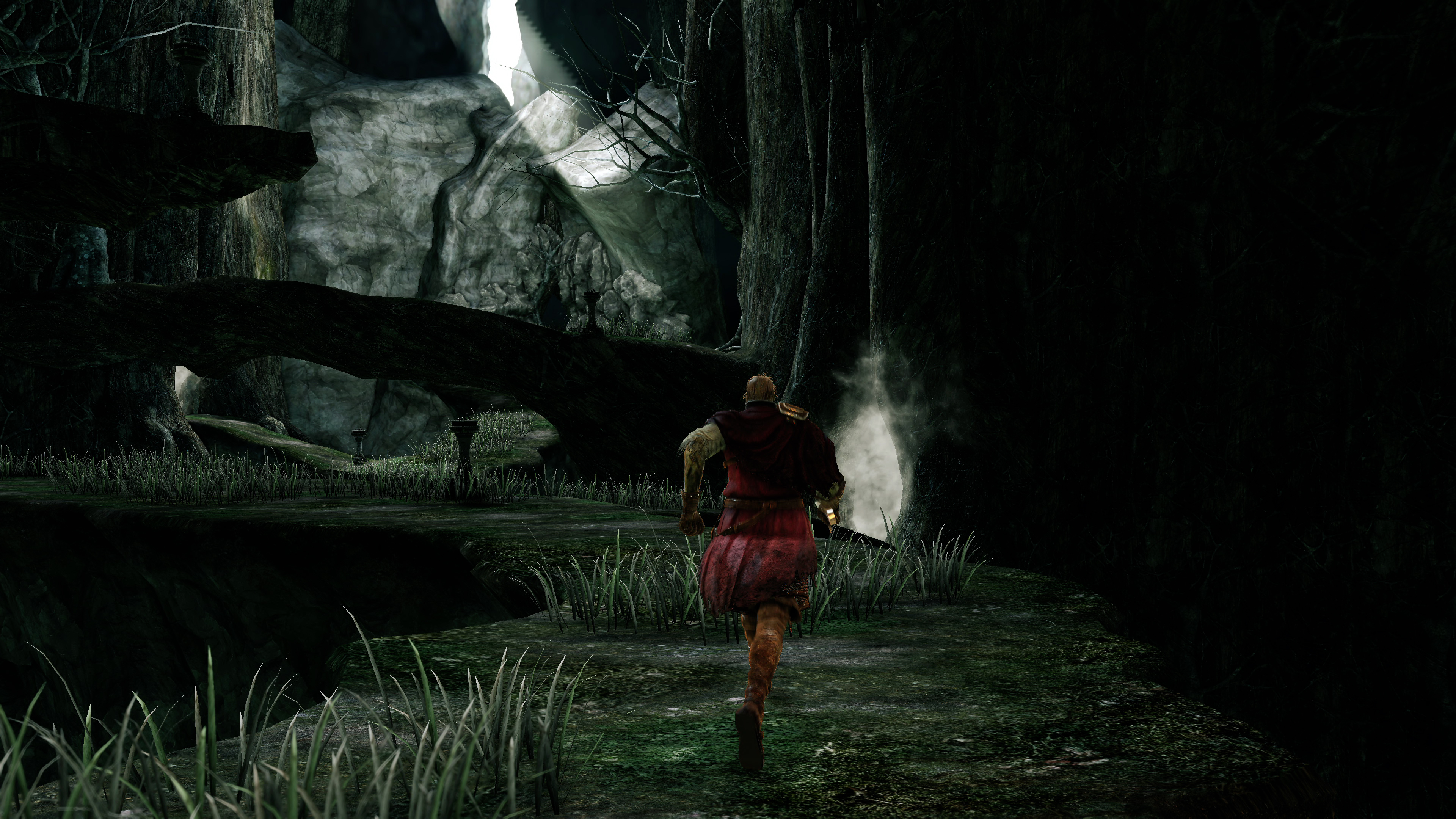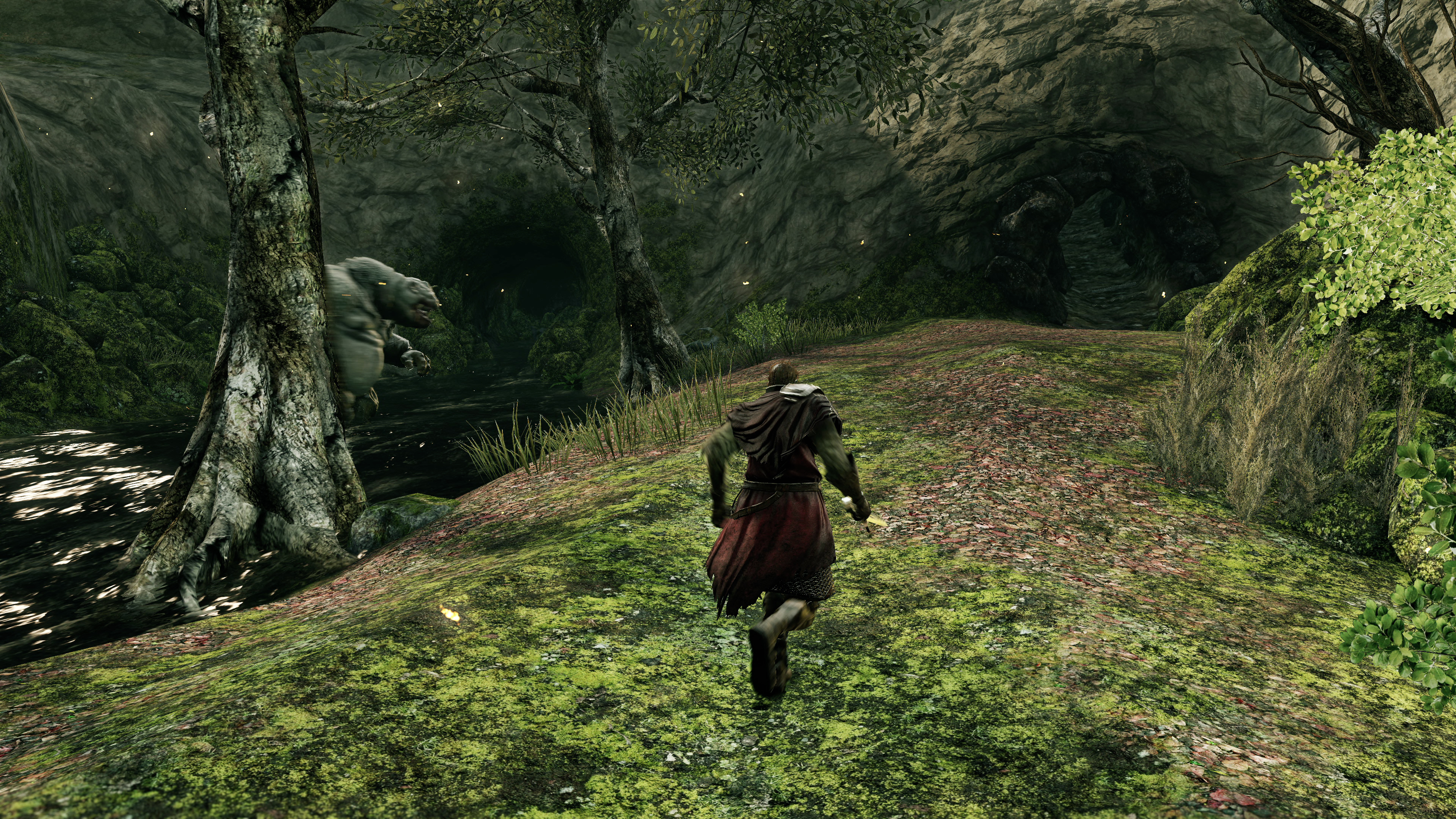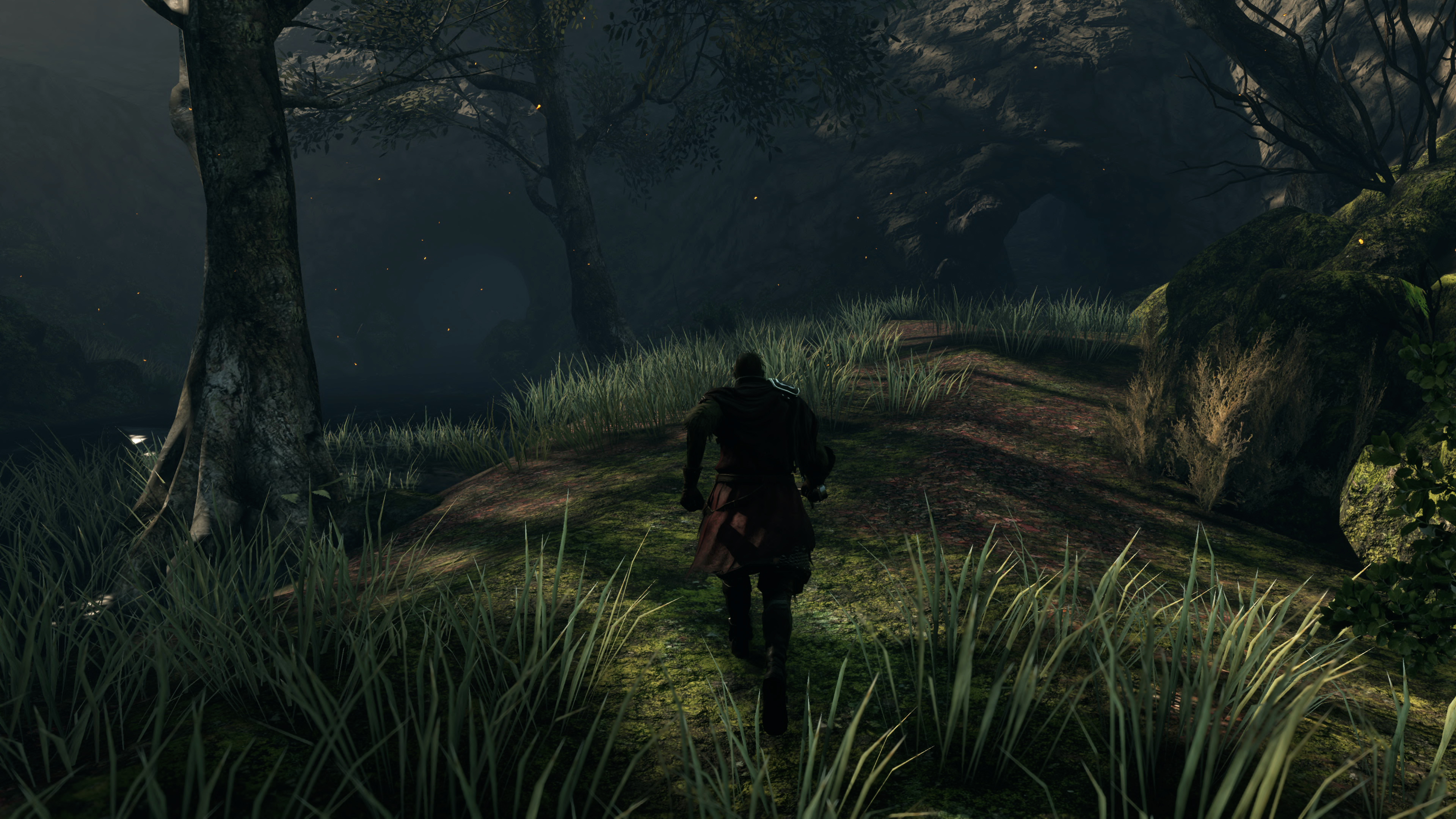 Moving to exterior areas, the shadow upgrades stand out most. These upgraded shadows take advantage of the (almost) fully deferred rendering approach in the Lighting Engine mod, which again, interprets the base game's logic to implement higher quality soft shadows. Characters and objects in the environment - notably overhanging trees - now cast shadows from most light points, and even the sun, in a more realistic manner. In the Forest of Fallen Giants, the Lighting Engine mod has a huge impact. Shadows cast by the scenery are added in - which were missing in the original game. Better still, this mod even offers multiple quality settings, ramping up to the PCSS option - for Nvidia's contact hardening soft shadows - which allows diffuse shade to appear the farther it gets from the light source. Proximity between the sun and occluding object is simulated in the end result, meaning player shadows will often, logically, look sharper nearer the ground. It's not using ray tracing, but the final effect of adding new shadows to the map, plus switching the game to PCSS, is an incredible feat of engineering.