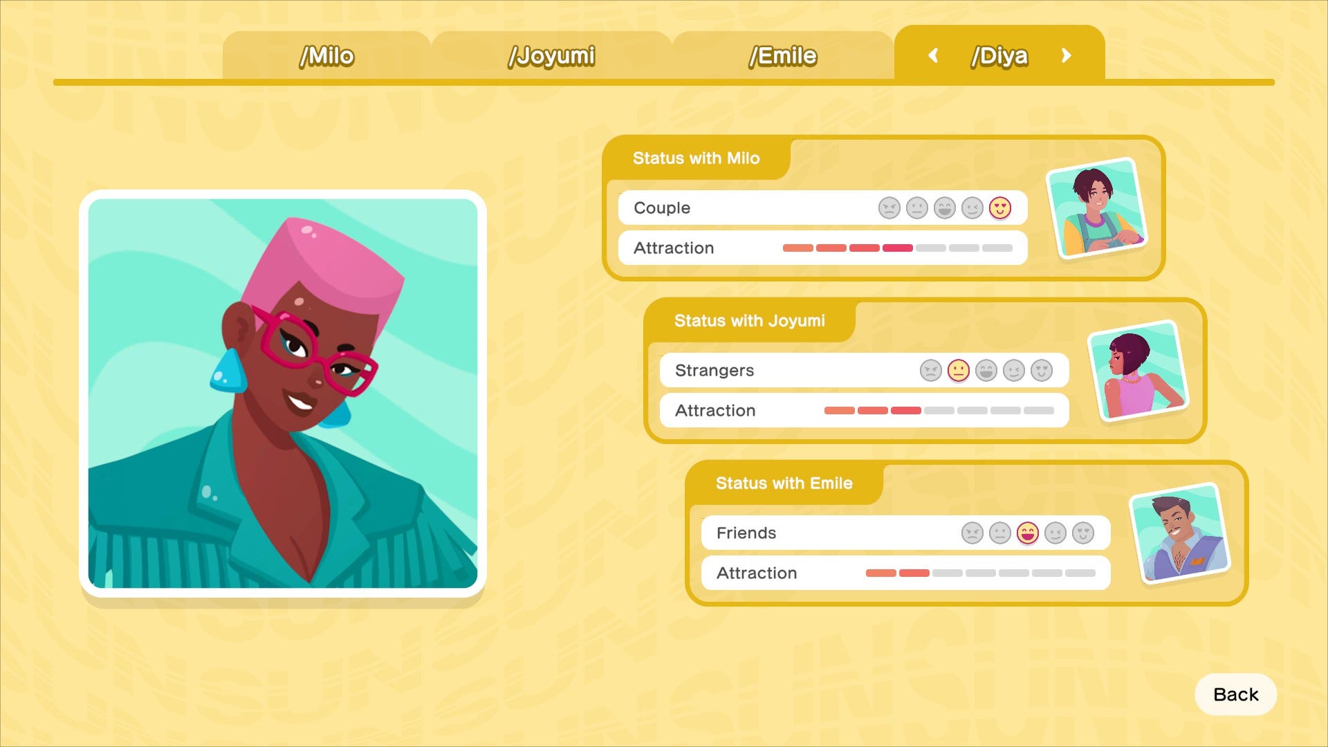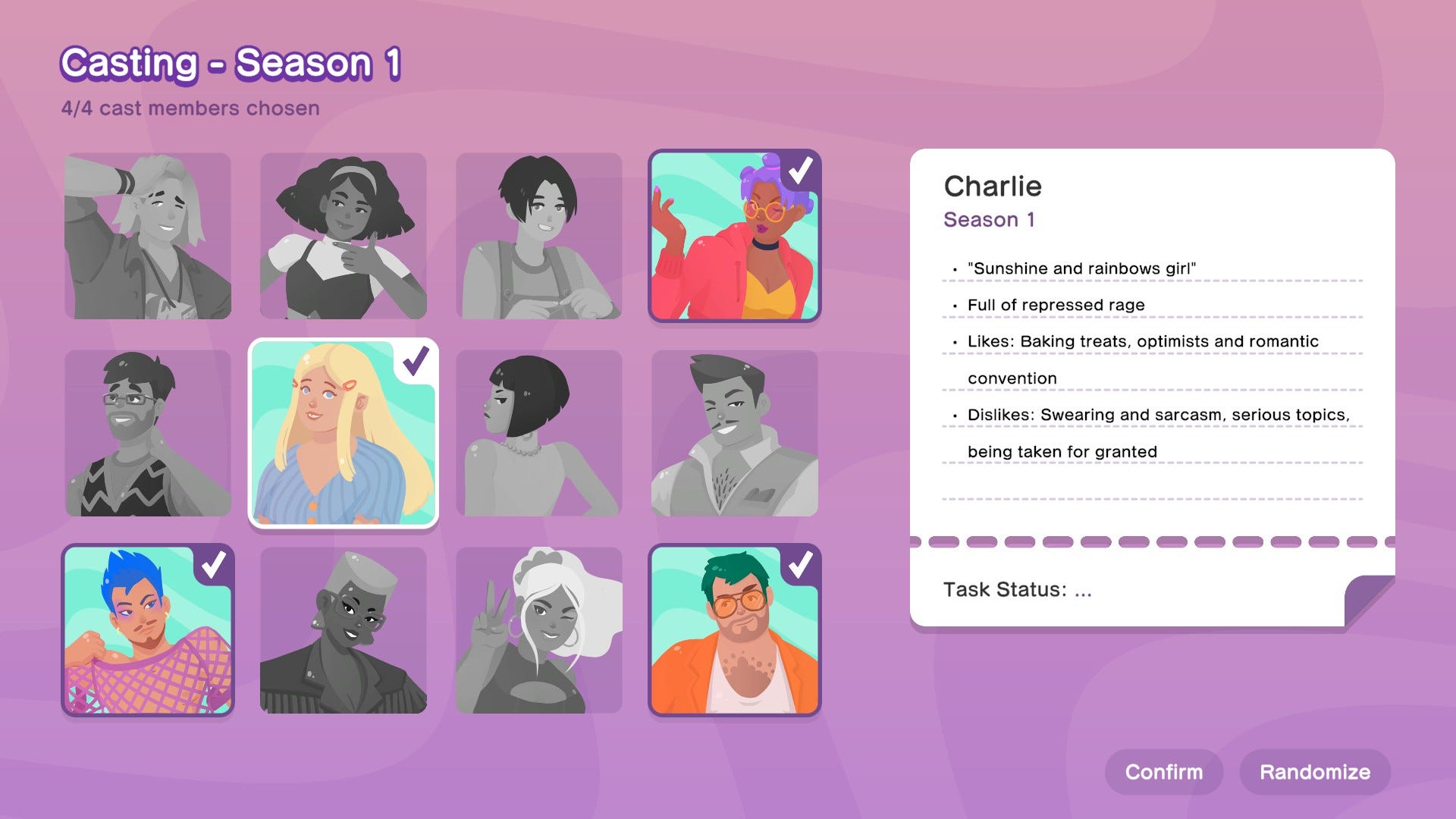 All the classic reality TV archetypes are present, albeit with a lot more diversity across the queer spectrum in how folks express themselves - and also in just how horny everyone is for everyone else. Relationships meanwhile can change as quickly as the audience's opinion of them. Blue-haired nightclub promoter Coco and wanna-be crypto bro Gunther might proclaim their love for each other in the morning, but then have a heated disagreement about margaritas and hate each other by the evening. The drama starts on day one and continues to roll out every day until the Season ends. There are a bunch of different personalities and their petty drama to get attached to, but my love of the cast did waver upon learning that dialogue isn't locked into one character, but shared amongst the cast. If you repeat days or replay the game, for instance, you'll see the same conversations but being spoken by different characters, which takes away from each character having their own personality.