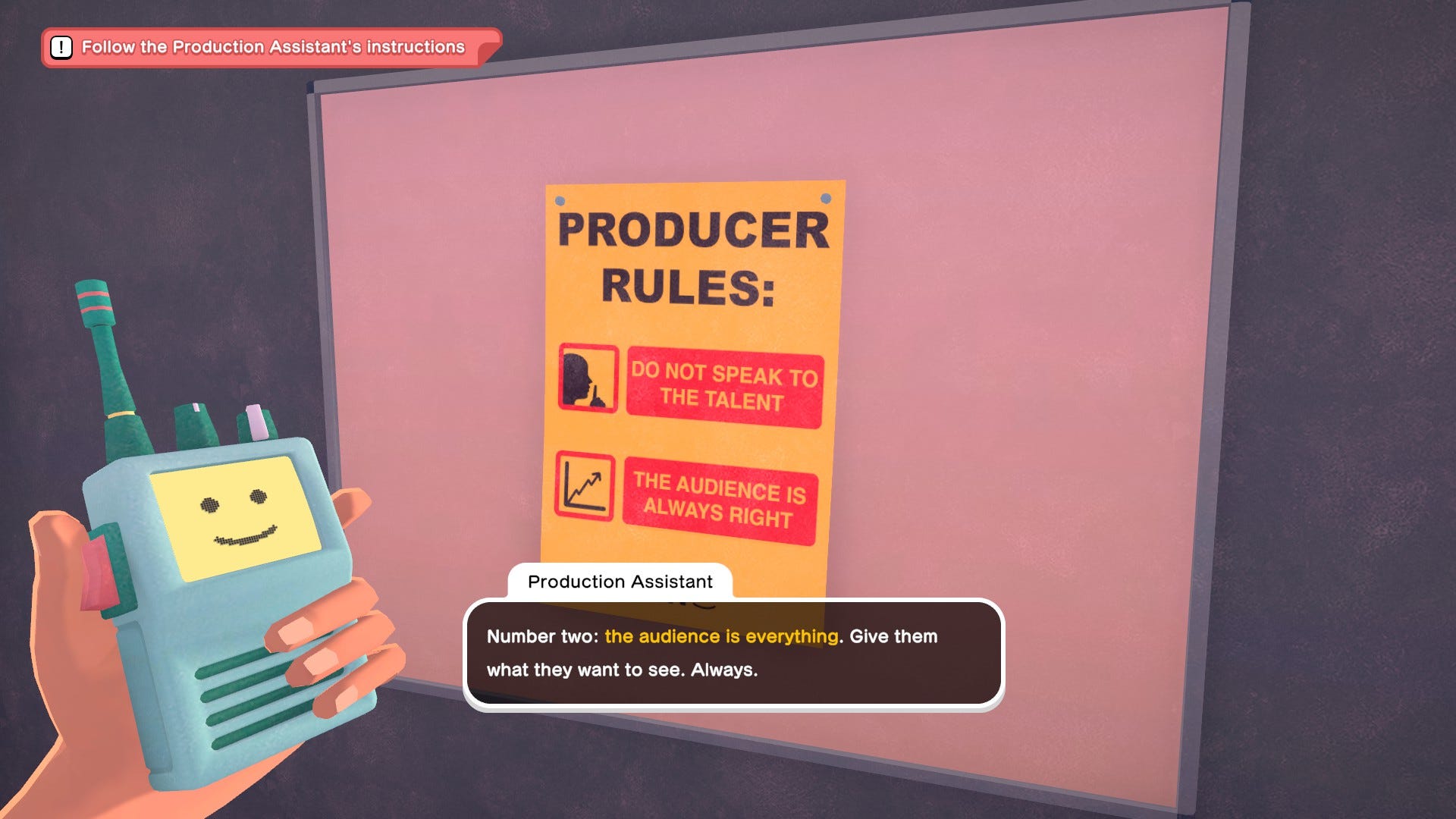 As you reach the end of your first Season, things start to take a turn and you begin to learn that there's something darker going on underneath the pink pastel surface. A strange voice crackles through to your walkie-talkie calling you to a previously-closed elevator that takes you beneath the house. Things start to unravel from there and cracks begin to show in the perfect paradise facade, including the cast. At night when the show is off-air they'll hang around the mansion asking you for favours, mostly to do with how they're portrayed on screen. The majority of them want to be stars, willing to participate in the circus of the entertainment-industry institution to obtain that dream. You get to see glimpses of their real selves before the mask goes back on - it's humanising, and a big reality check. Of course, this isn't allowed, as stated by the Network's two golden rules: Don't talk to the cast, and the audience is always right. So, what happens when these rules get broken?